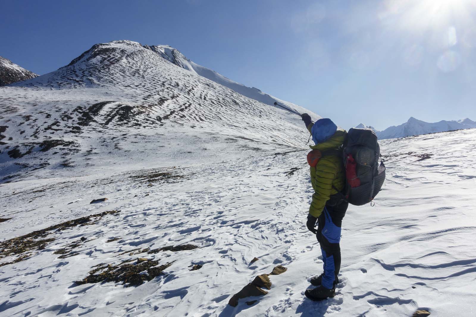 Minule som aklimatizáciu strávil v stráni s dobrým výhľadom juhovýchodne od tábora. Dnes mierime na jeden z vrcholkov na hrebeni na východe. Vyhliadnem si výstupovú líniu, počas stúpania z nej však ľahkovážne upúšťam a nahor mierime prudkým žľabom, v ktorom sa asi 50 výškových metrov pod vrcholom zasekneme. Sme 360 metrov výškových metrov nad táborom, a tak nad tým mávneme rukou a posadíme sa do trávy. Kvôli tým chýbajúcim štyridsiatim metrom, ktoré nám chýbajú do plánovanej aklimatizačnej štyristovky, nestrávime ďalšiu hodinu liepaním sa po šmykľavom trávnatom svahu...
